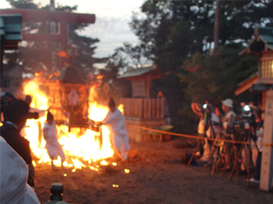 獅子と神輿とが地域を一巡した後、神社境内で燃やされた炎の上を走り抜けて穢れを焼き払う勇壮な神事です。