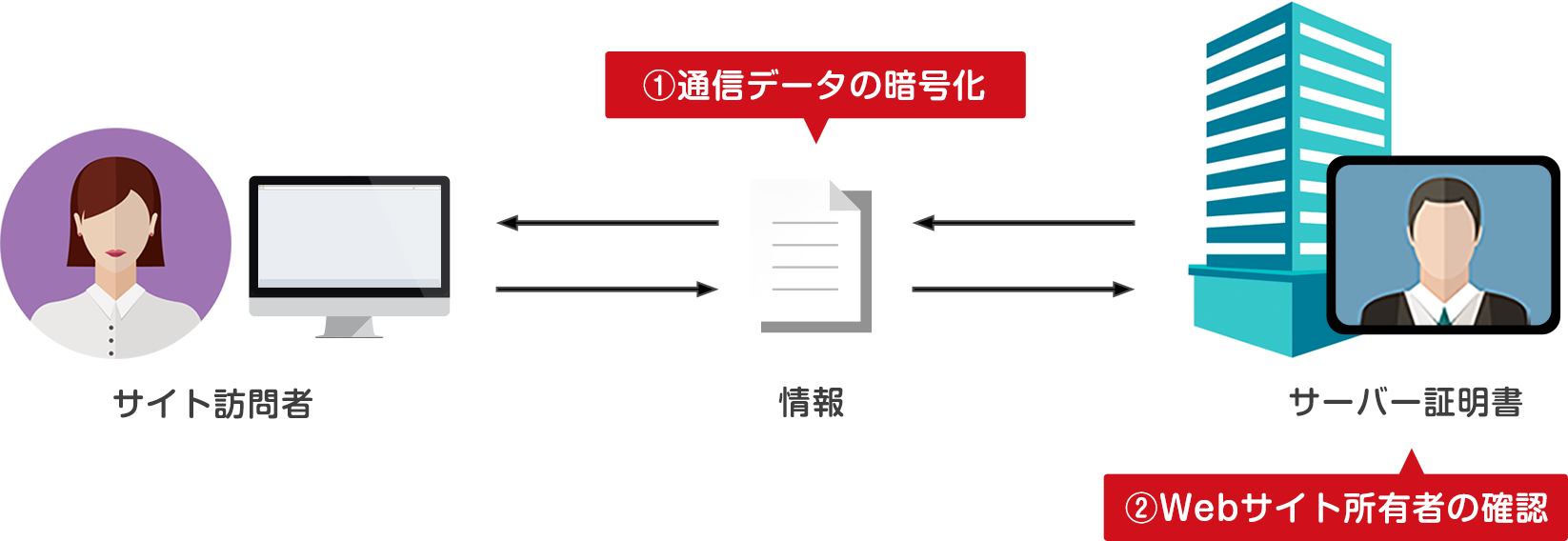 サーバー証明書は信頼の置ける第三者機関=認証局が発行する電子的な証明書で、二つの機能を持っています。