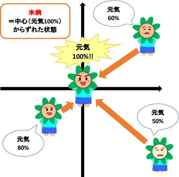例えば、ベストの状態を中心の点だとすると、未病の状態は、中心からずれた位置に点があるっていうこと。