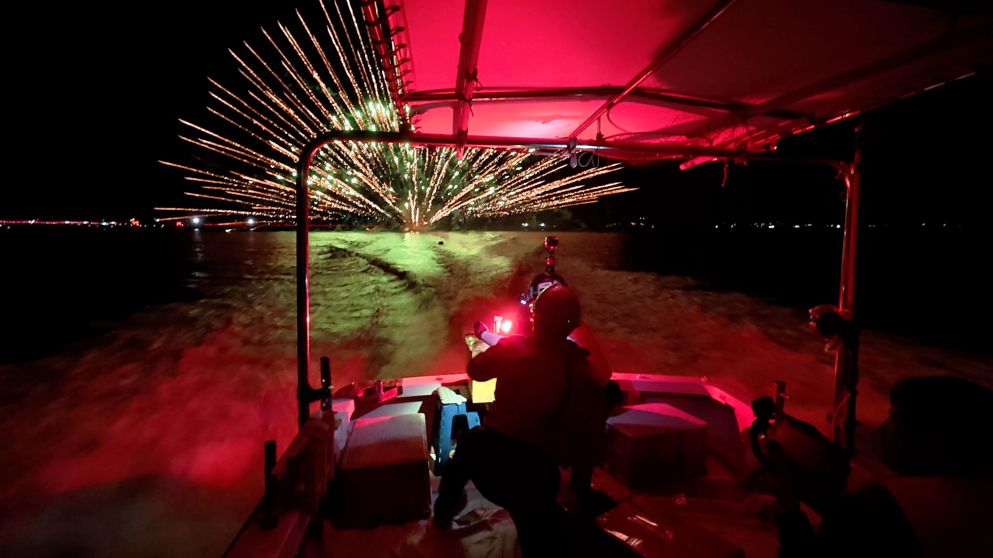 海上で弾け七色の光を放ちながらきらめく光景は、まさに圧巻。