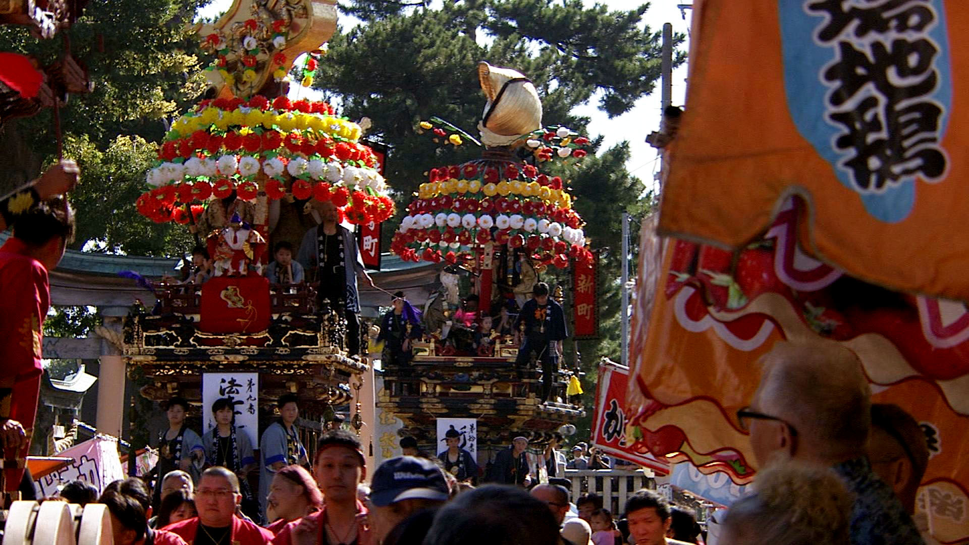 13基の曳山がクロスベイ新湊に集まり、花山から提灯山へ装いを変える様子と、夜の出発式の模様をお送りします。