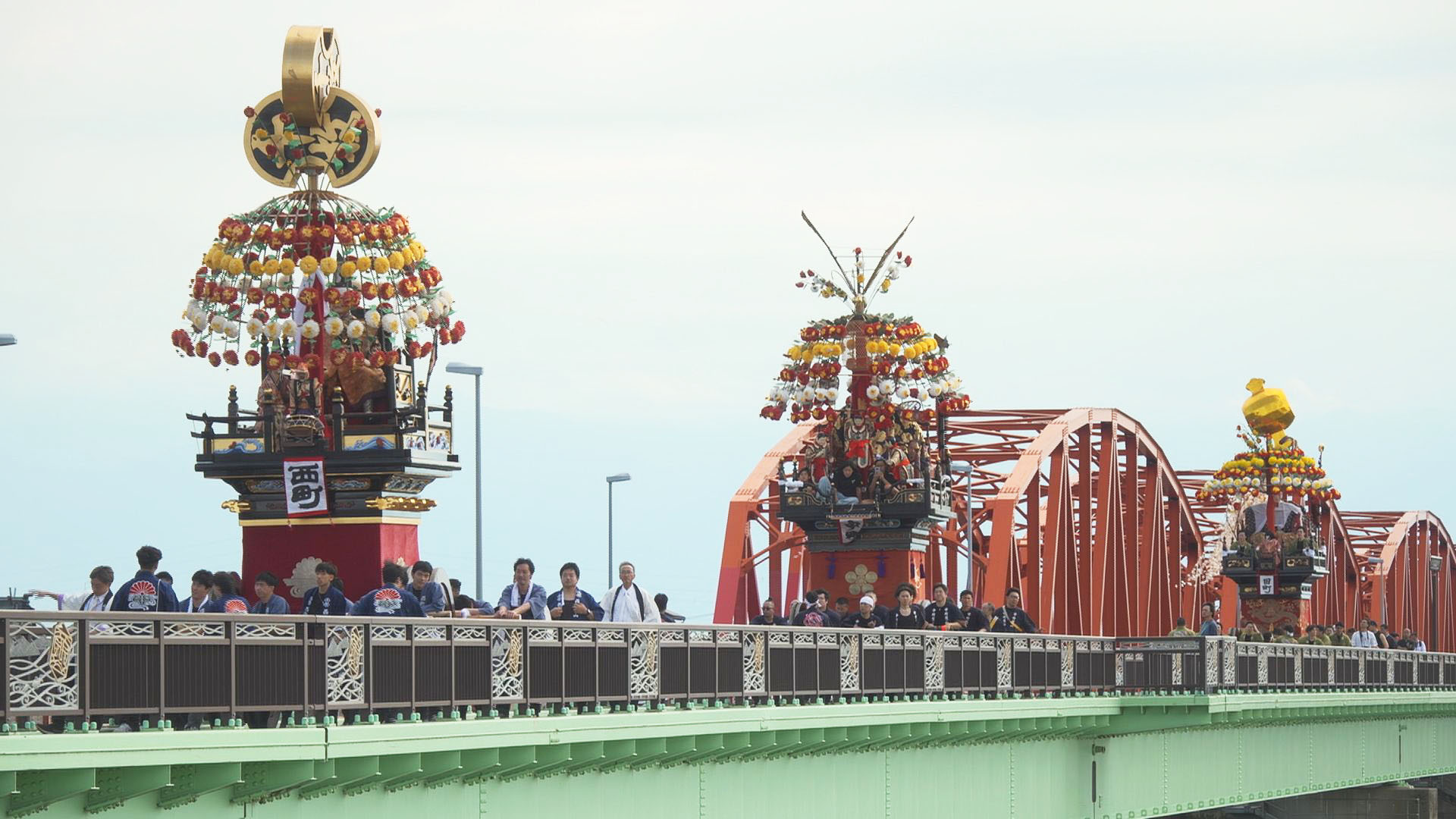 大門大橋を曳山が連なって渡る「橋渡し」や、曳山の前方を担ぎ上げて方向を変える「ヨッコ」は、大門の曳山ならではの光景です。