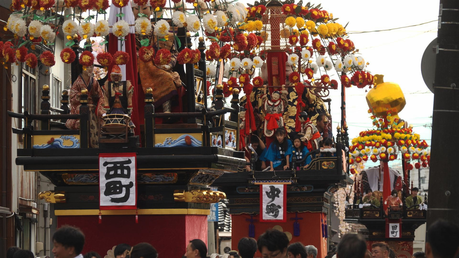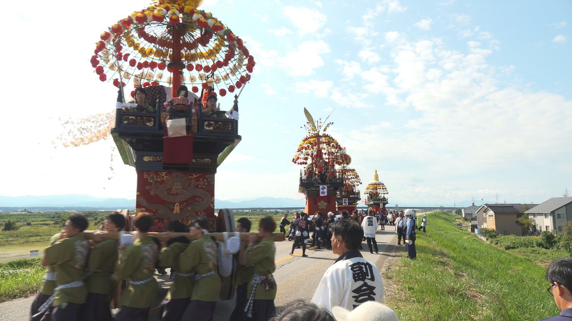 明治時代の初期に始まったとされ、4基の曳山が車輪を軋ませながら一日巡行し、県内各地で行われる曳山行事の最後を飾ります。