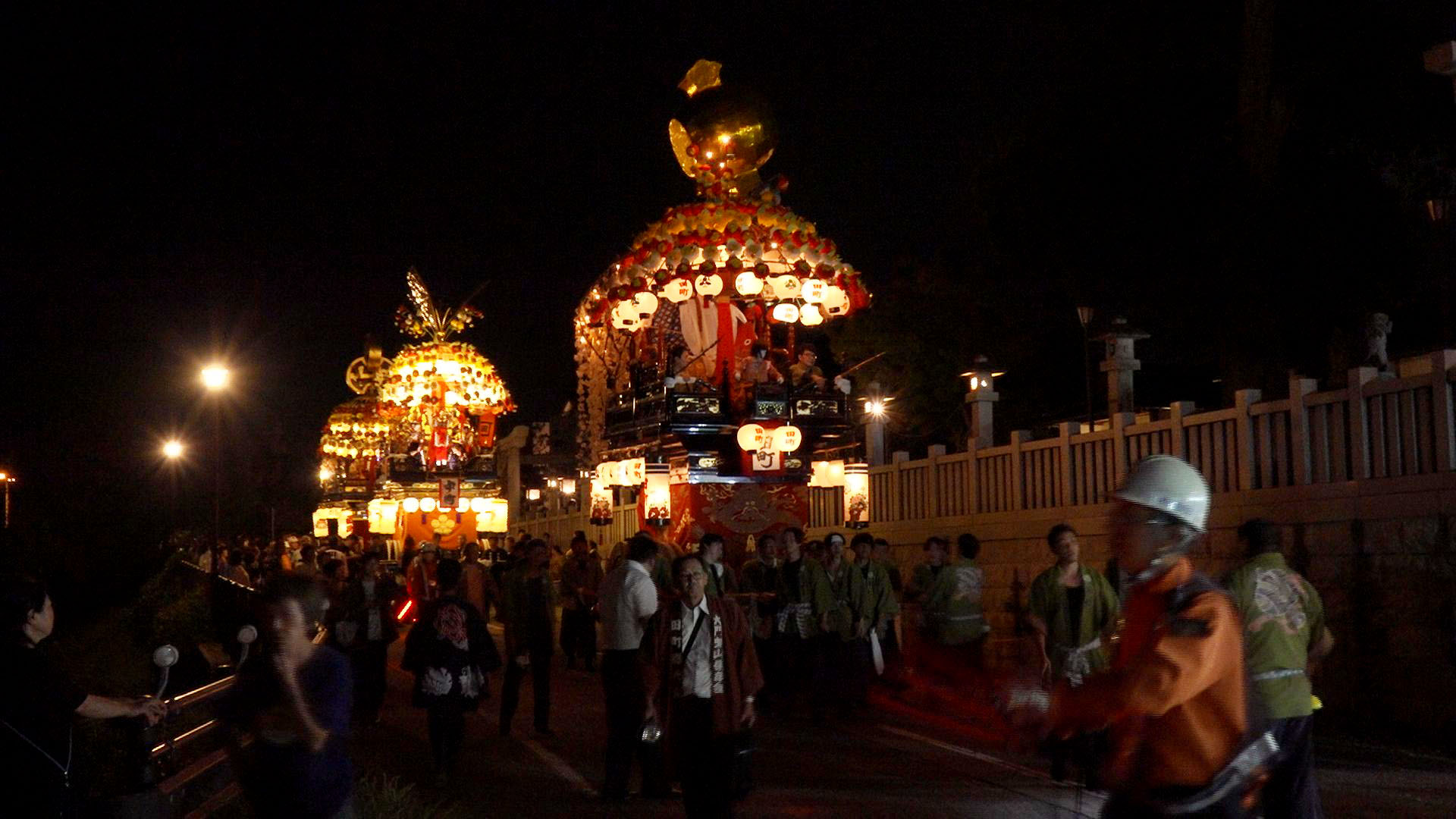 大門大橋を曳山が連なって渡る「橋渡し」や、曳山の前方を担ぎ上げて方向を変える「ヨッコ」は、大門の曳山ならではの光景です。