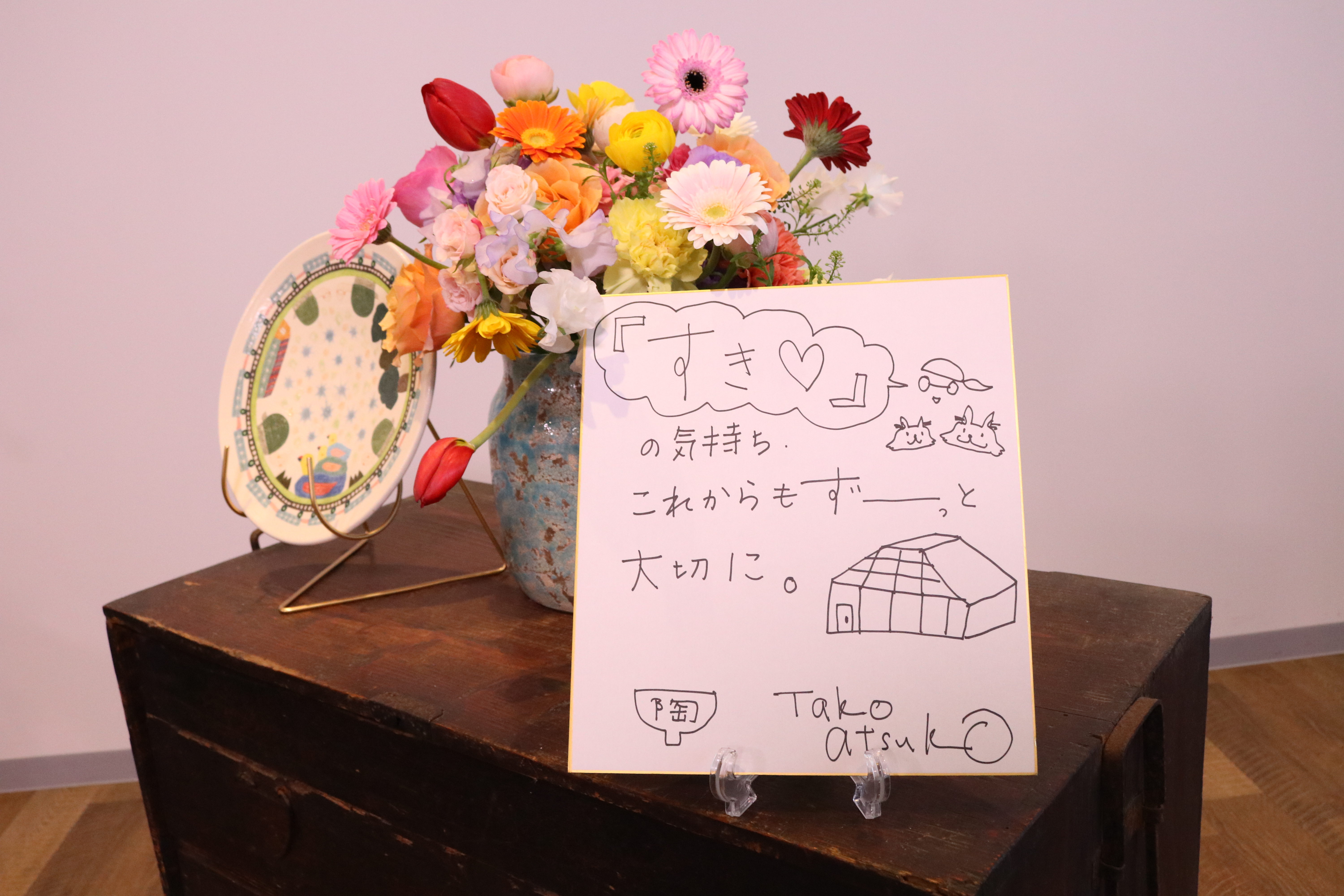 魅力的で、温かく可愛らしい作品を作られているたこさんに、形も色もとっても可愛いお花たちを束ねました。