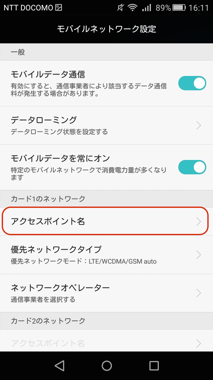 射水ケーブルにてスマートフォンをご購入頂いたお客さまは出荷時に設定投入済みのため以下の操作は必要ありません。 以下のAPN設定手順のキャプチャ画像などはHUAWEI製 P8 liteになりますが Android端末の場合はほぼ同様の操作となります。iPhoneなどiOS搭載端末のAPN設定はこちらをご参照ください。